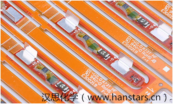 漢思新材料自主研發的HS700系列底部填充膠是一種單組份、快速固化的改性環氧膠粘劑,為CSP(FBGA)或BGA而設計的可返修的底部填充膠。它能形成一種無缺陷的底部填充層,能有效降低由于芯片與基板的熱膨脹系數不匹配或外力造成的沖擊,提高產品的可靠性。在手機電池保護板芯片底部填充及封裝應用方面,HS710、HS712是主力產品。其中,HS710是專門設計用于芯片的底部填充膠,具有良好的電絕緣性能,粘度低(340 cP@25℃,5rpm)、快速填充、覆蓋加固,對各種材料均有良好的粘接強度。